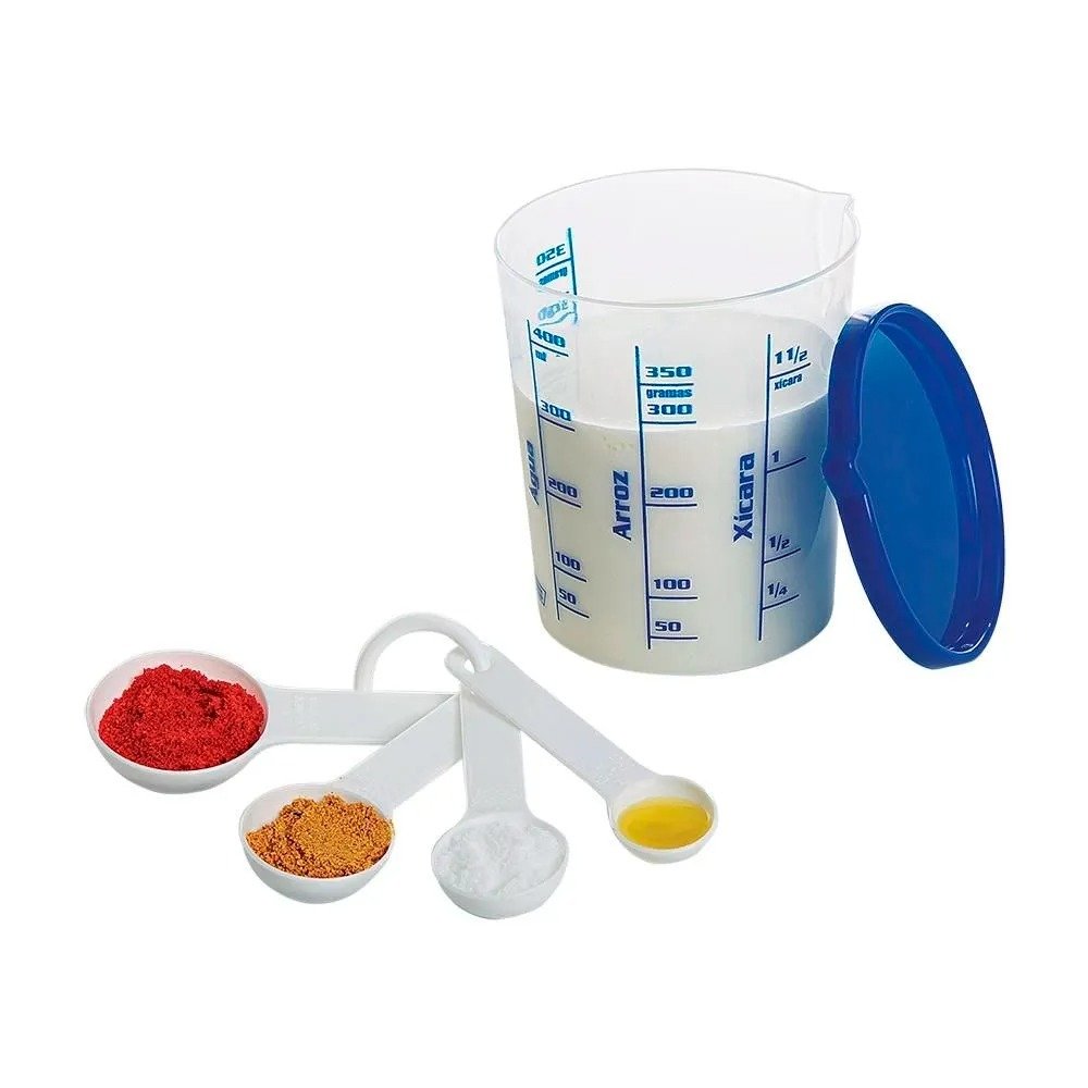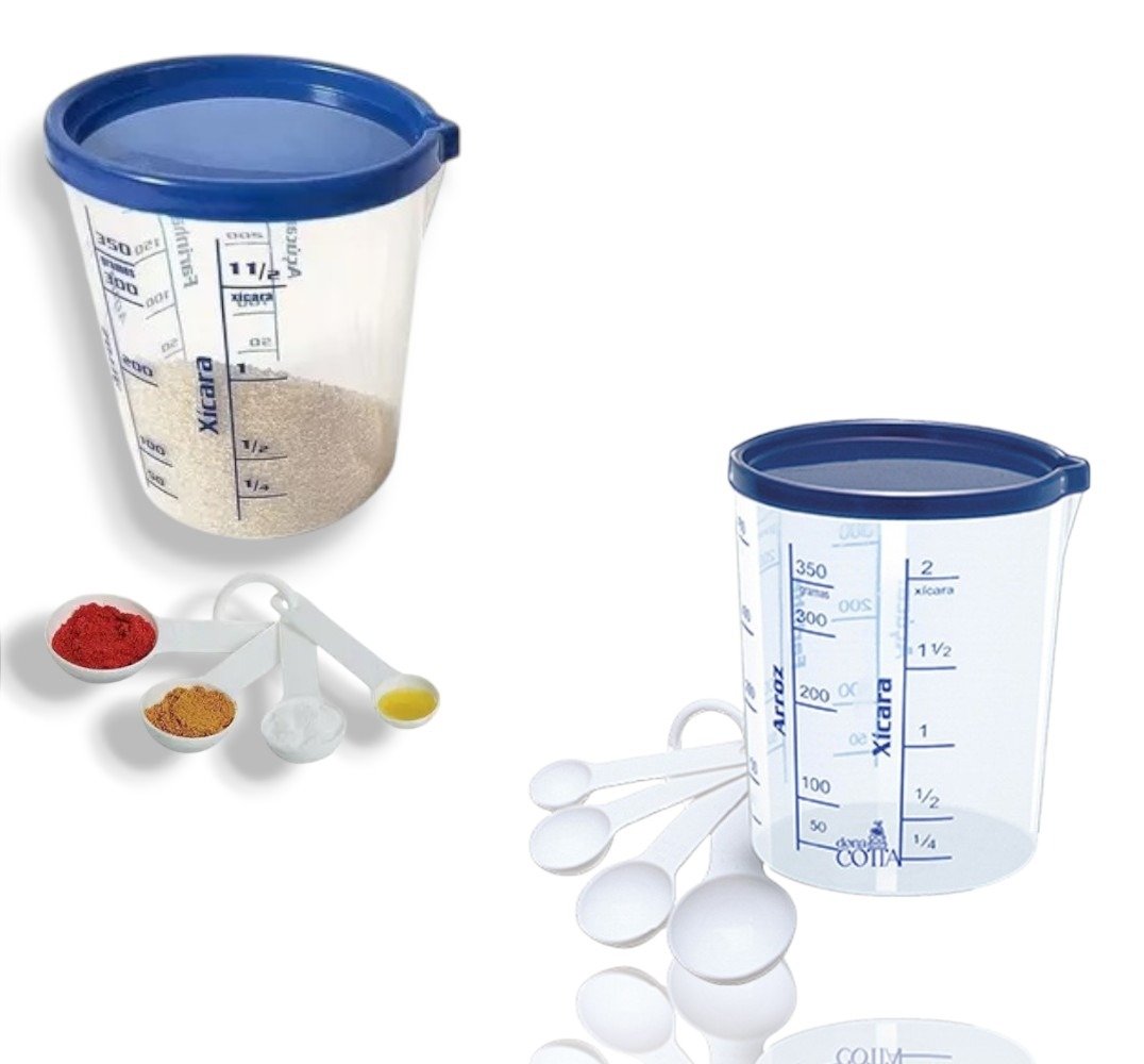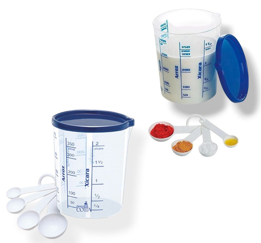 O medidor com tampa de 400ml da injetemp é um conjunto que inclui um copo medidor com tampa e quatro colheres de medida. O copo possui marcações com medida e nome de ingredientes (açúcar, farinha, água, arroz, xícara) e é ideal para auxiliar o preparo de alimentos que necessitam medidas exatas.